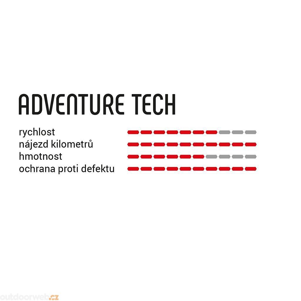 - Plášť ADVENTURE TECH poskytuje lepší trakci na mokrém i suchém terénu, což zvyšuje bezpečnost a kontrolu nad kolem.