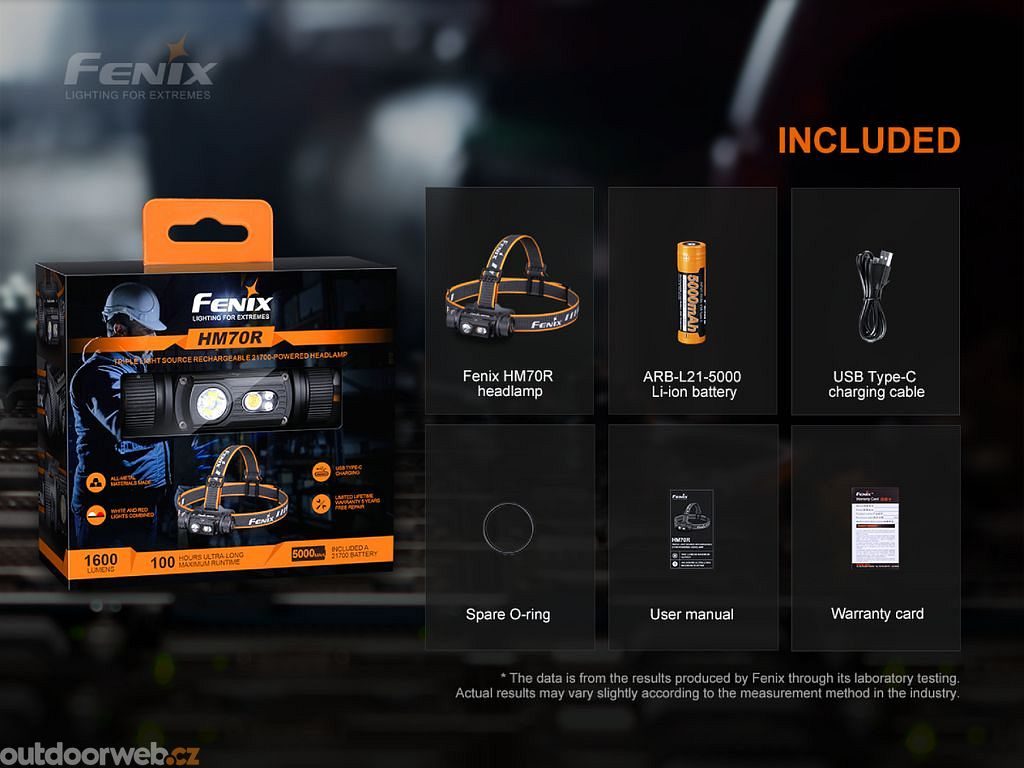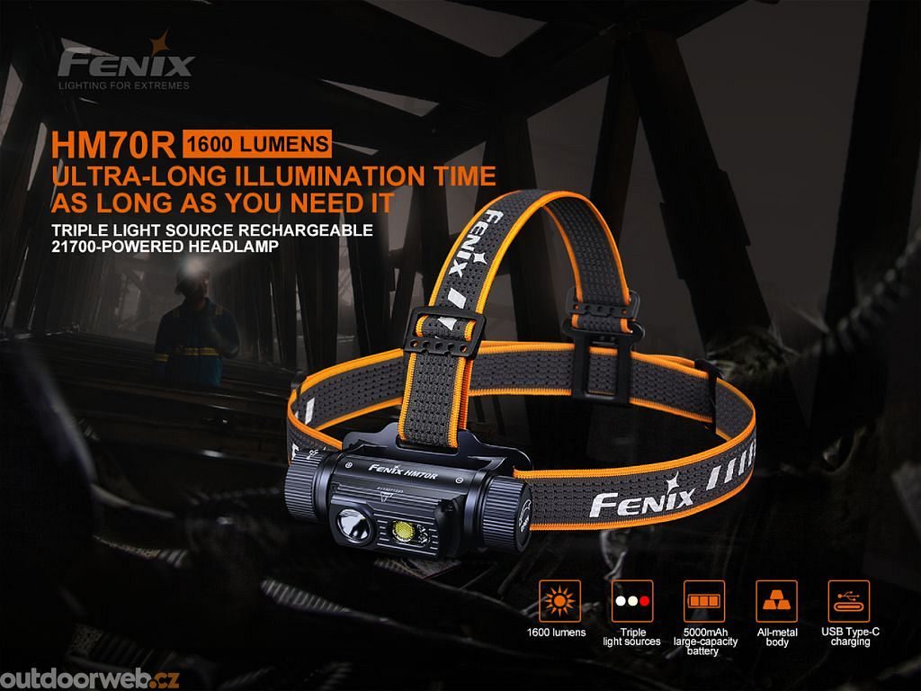 Fenix HM70R je extrémně výkonná nabíjecí čelovka, která nabízí světelný tok až 1600 lumenů. Součástí balení je i nabíjecí Li-ion akumulátor typu 21700 s kapacitou 5000 mAh, který se nabíjí přímo v čelovce přes USB-C konektor. Čelovka je osazena více světelnými zdroji, v dálkovém reflektoru se nachází LED Luminus SST-40, která dosvítí až na vzdálenost 186 metrů.