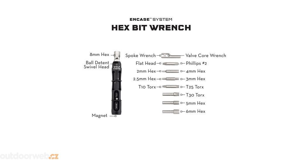 Klíč s imbusy EnCase. Samostatné nářadí z řady EnCase pro nejběžnější opravy v terénu. Obsahuje 14 druhů klíčů. Možno vozit v brašničce, batohu, anebo po dokoupení úložných rukávů v řidítkách.