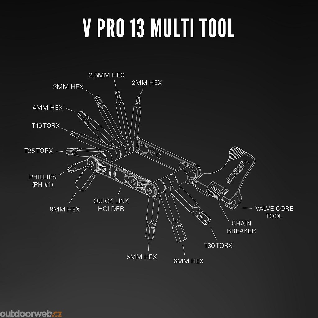V PRO 13: HEX 2/2,5/3/4/5/6/8mm, TORX T10/T25/T30, PHILLIPS, AL CHAIN BREAKER, LINK STORAGE
