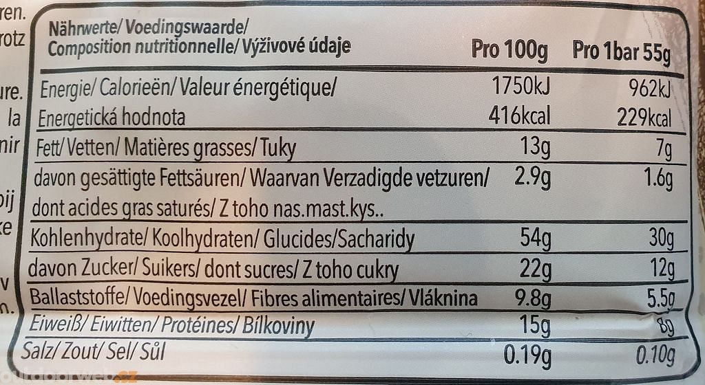 Složení: sójová směs 22% (sójová mouka, sójový proteinový izolát), rýžový sirup, rýžový crispies kakaový (rýžová mouka, cukr, glukózový sirup, kakaový prášek 4%, ječný sladový výtažek, sůl), ovesné vločky, čokoláda 8% (kakaová hmota 46%, cukr, kakaové máslo 10%, emulgátor: sójový lecitin), melasa, rostlinný tuk(palmový, shea), pasta ledový kaštan (kaštany 17%, cukr, glukózový a fruktózový sirup, kakaový prášek, zahušťovadlo: karagenan, aroma), kakaový prášek 2%, zvlhčovadlo: glycerin, třtinový cukr, aroma káva, kakao: obsah min. 55%.