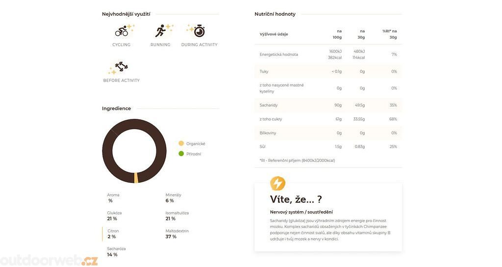 Díky tomu je výrazně omezen výkyv hladiny krevního cukru v průběhu výkonu. Energetický nápoj je obohacen ionty sodíku, draslíku, hořčíku a vápníku. Použité suroviny jsou v přírodní formě. Chimpanzee energetický nápoj Vám zajistí dostatek energie, hydratace a rychlou svalovou regeneraci.