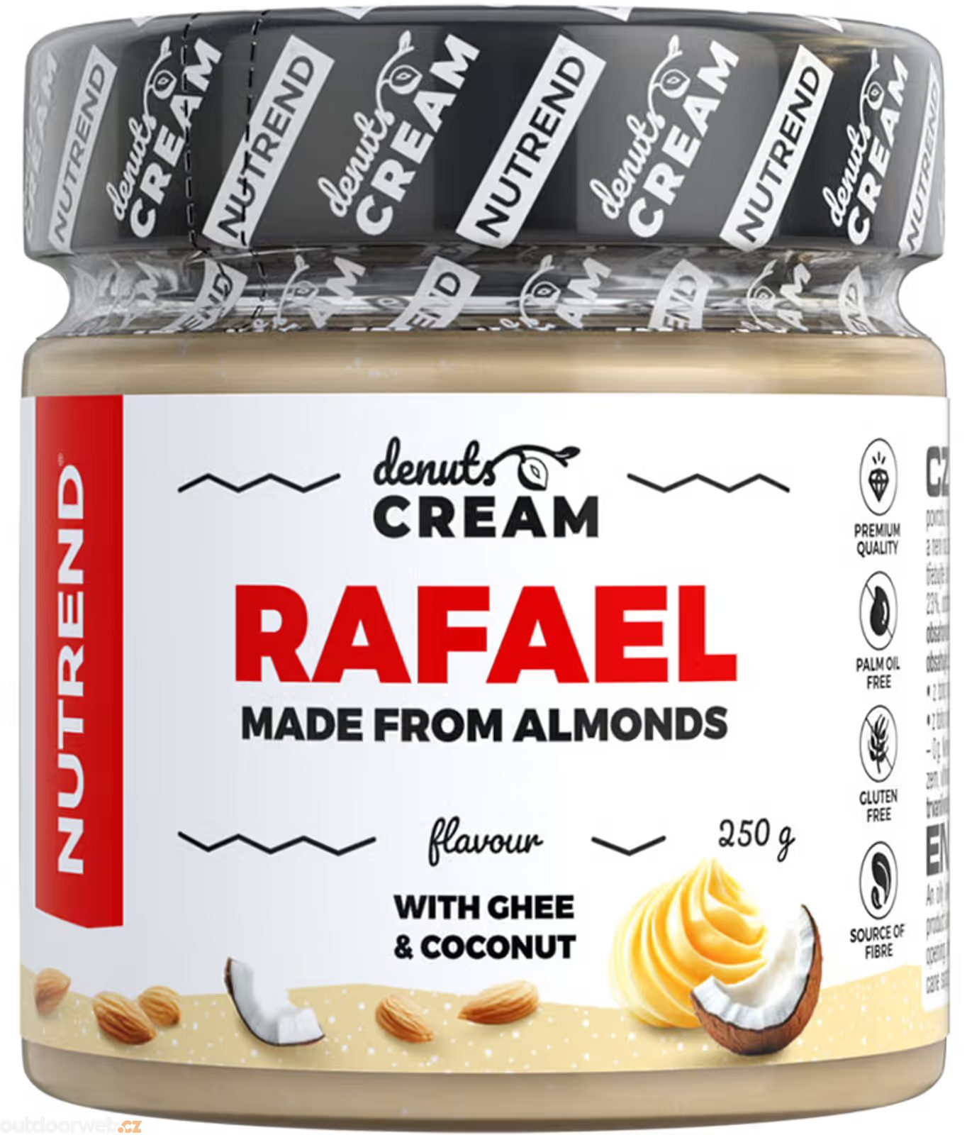 Složení: Mandle 35 %, třtinový cukr, kokos 23 %, odstředěné sušené mléko, GHÍ (máselný tuk) 2 %. Může obsahovat stopy i jiných ořechů, arašídů a sóji.