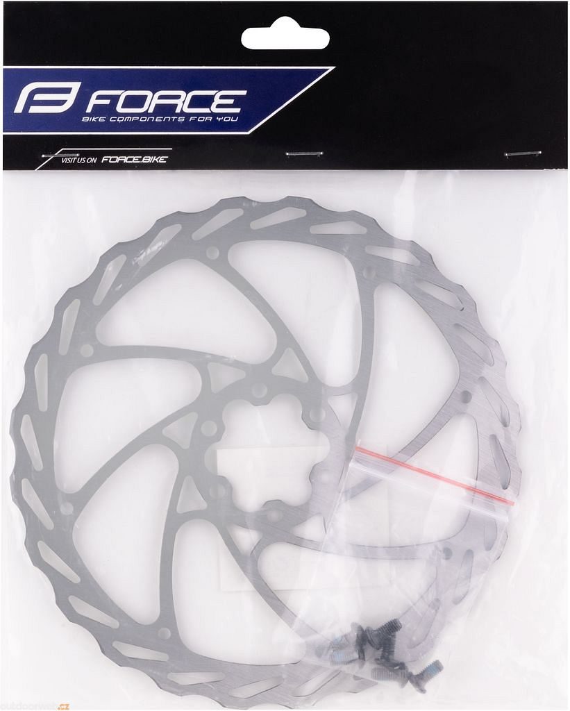 Stříbrný brzdový kotouč FORCE průměru 180 mm z nerezové oceli určený pro upevnění pomocí 6 šroubů, včetně torx šroubů, balený v ochranném sáčku s kartou.