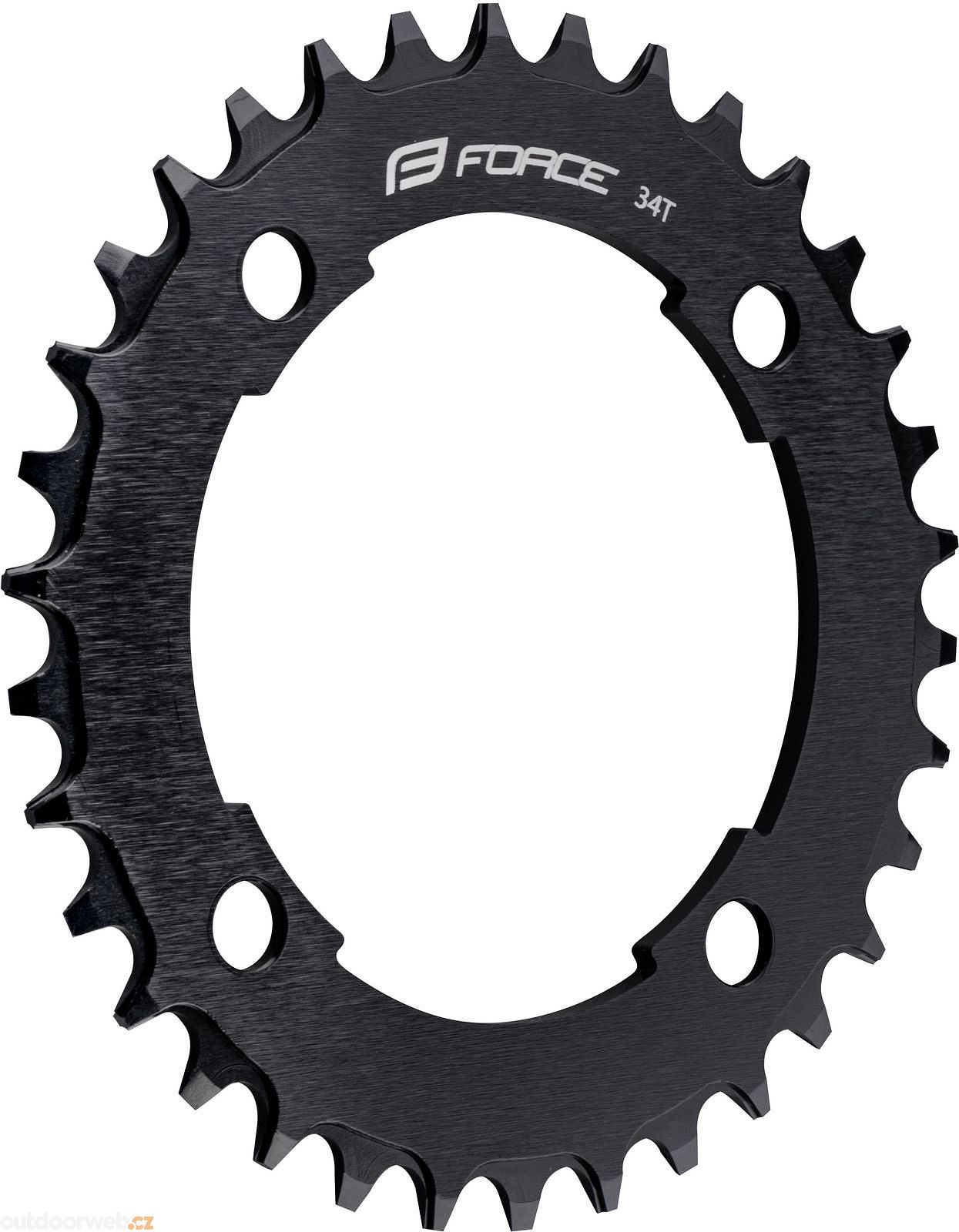 Jednobarevný převodník MTB FORCE ELEVEN 1.7+ s 34 zuby určený pro kliky tohoto typu, vyrobený z hliníku CNC technologií s rozměry na míru klikových systémů 104 mm, určený pro 11. kolo.