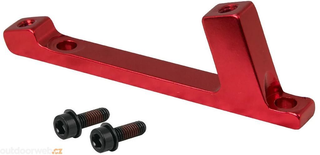 Červený přední adaptér POST/Postmount pro kotoučové brzdy o průměru 180 mm s dvěma šestihranných šrouby pro montáž, vyrobený z lehkého hliníku o hmotnosti 40 g, balený v sáčku.