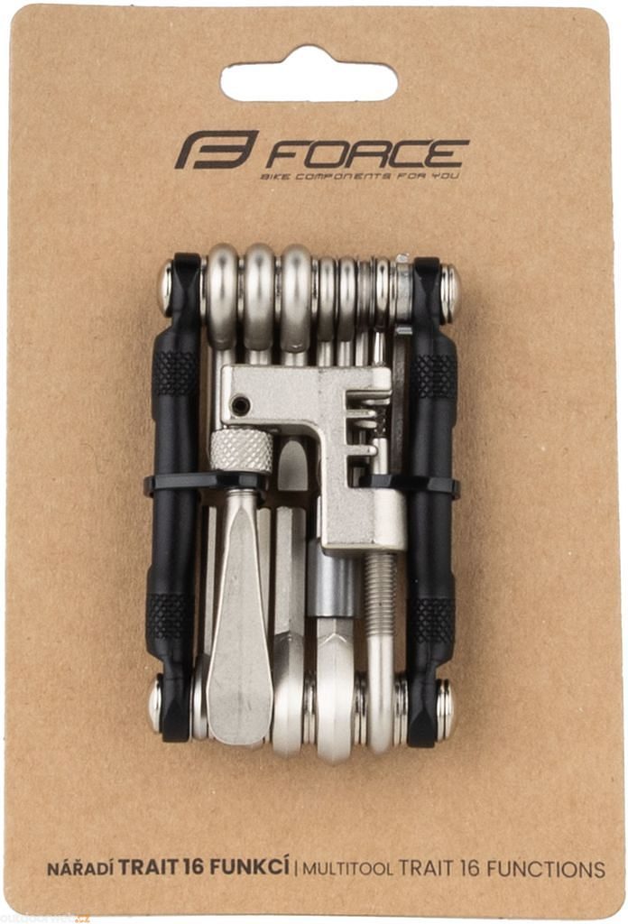 Sada FORCE TRAIT s 16 funkcemi obsahuje šestihranné klíče, nýtovač řetězu, šroubovaky, klíče Torx, čistící jehlu, zaváděcí jehlu a montážní páčku, vyrobenou z oceli Cr-V a hliníku.