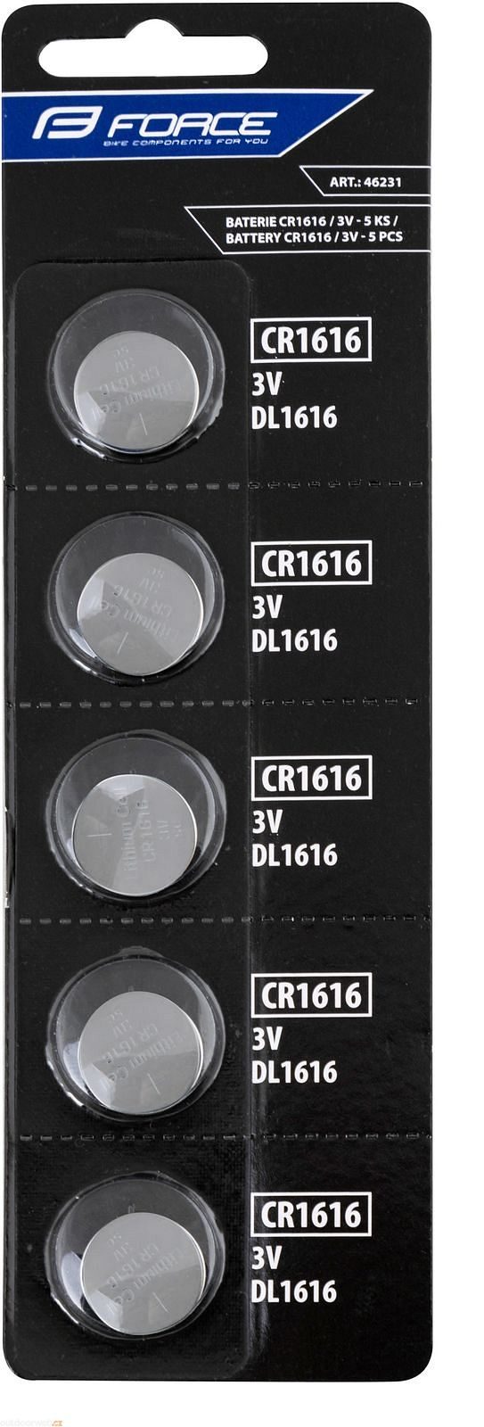 Sada pěti mincových baterií FORCE CR1616 o napětí 3V je určena například pro cyklopočítače CATEYE a podobné elektronické přístroje, přičemž uvedená cena se vztahuje na celý blister obsahující všech pět kusů.