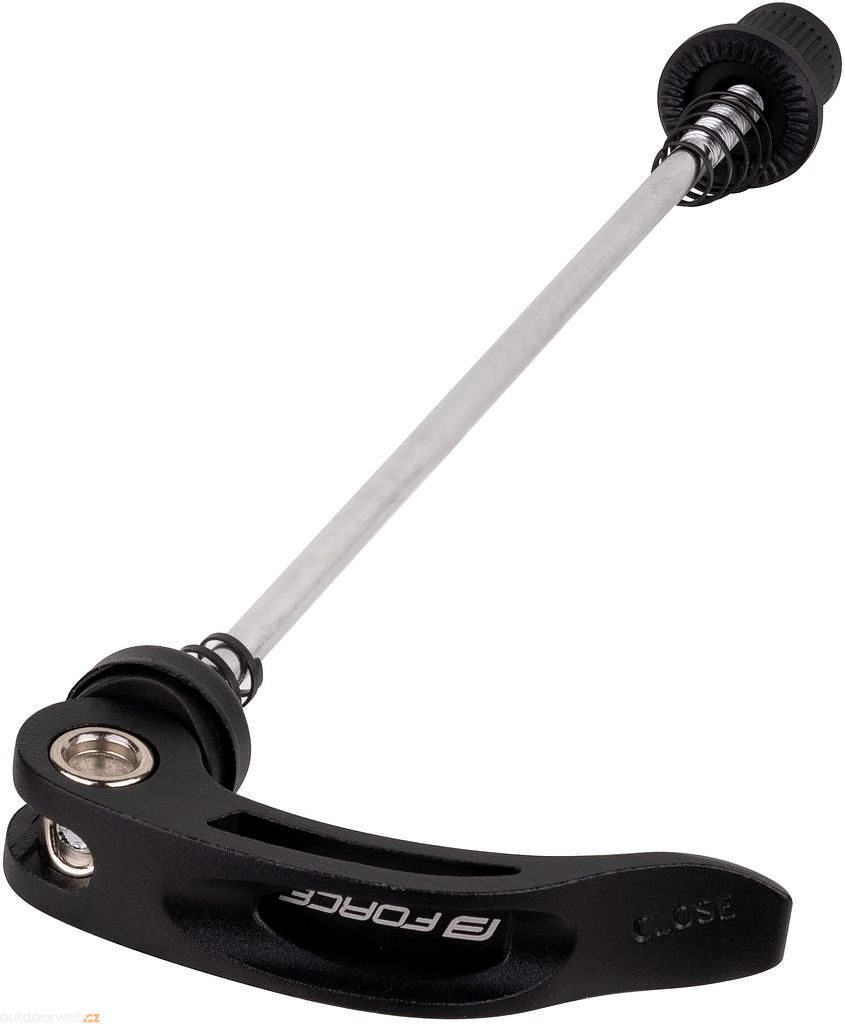 Černý matný hliníkový rychloupínák zadního kola s železnou osou, celkovou délkou 170 mm a užitkovou délkou táhla 151 mm.