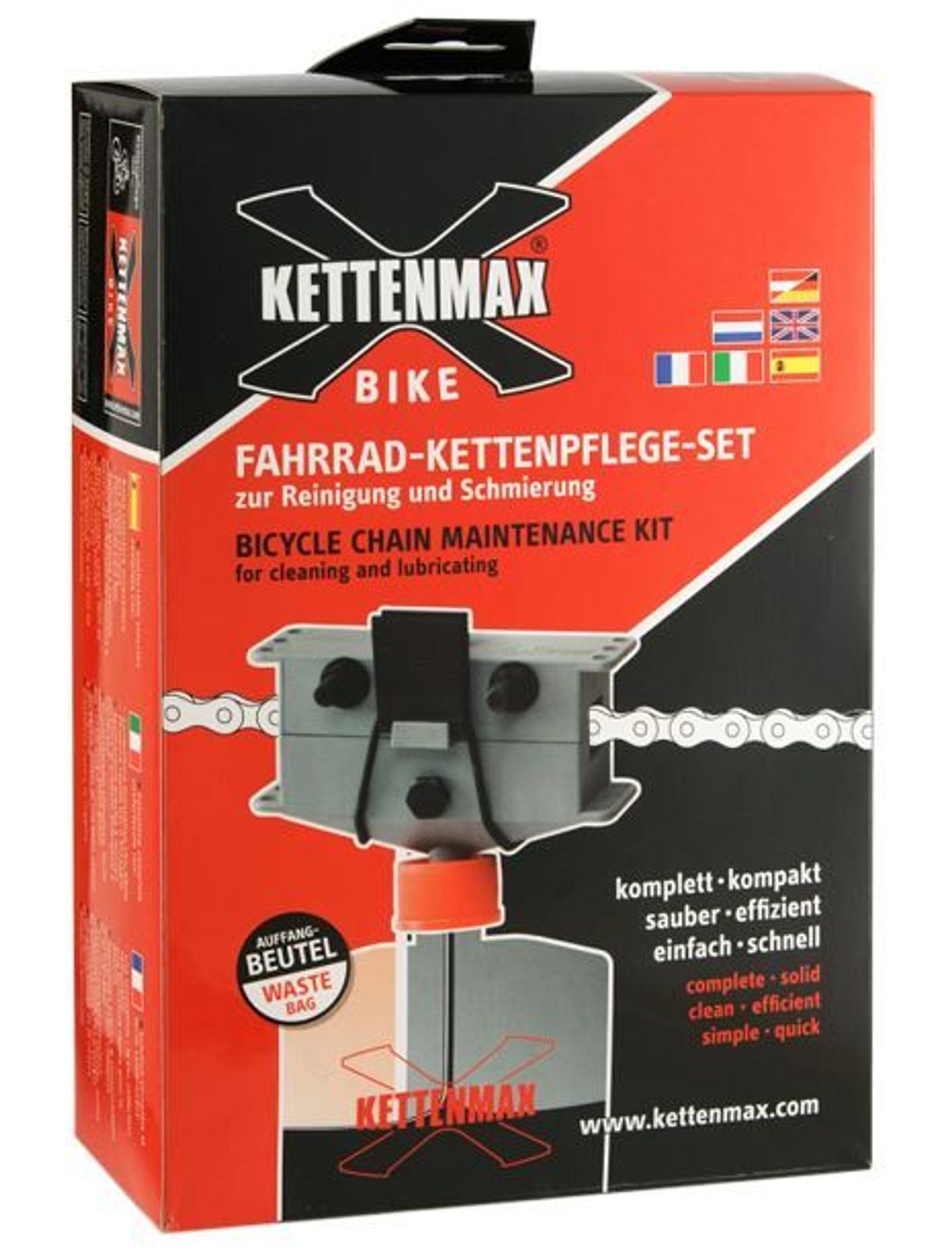 Kettenmax Bike je profesionální víceúčelové zařízení pro efektivní údržbu řetězu, kombinující čištění a mazání v jednom systému. Zajišťuje ekonomické a ekologické čištění bez znečištění kola či okolí.