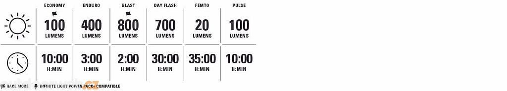 Funkce: IPX7, Denní blesk, Závodní režim, Nekonečné světlo Power Pack+
