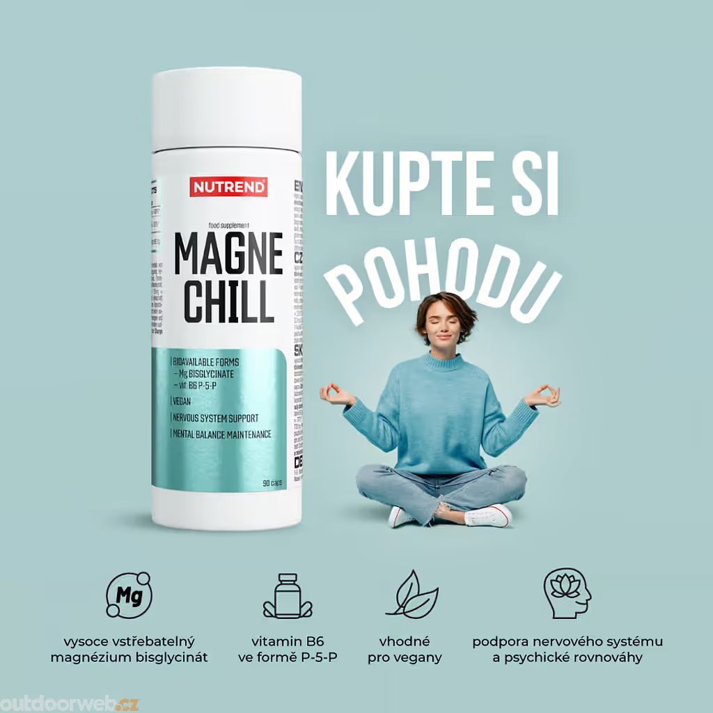 Magnechill, 90 kapslí vám přináší denní dávku chillu pro tělo i mysl. Kombinace vysoce vstřebatelného bisglycinátu hořečnatého a aktivní formy vitaminu B6 (P-5-P) podporuje nervový systém, psychickou pohodu a tvorbu nových buněk, takže se skvěle hodí po tréninku, náročném dni nebo před spaním.