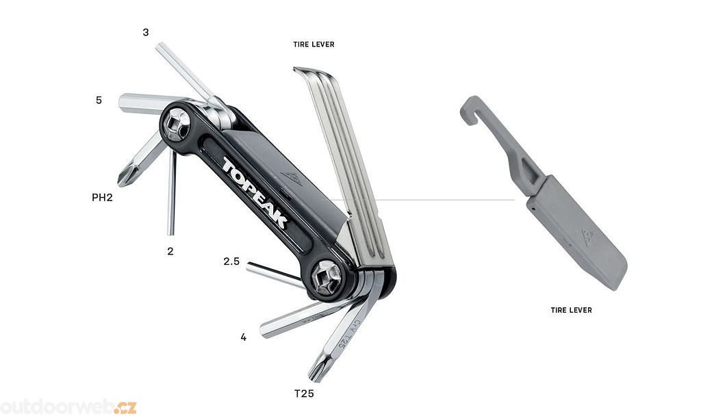 Nástroje: Mini 9 Pro - 2 / 2.5 / 3 / 4 / 5 mm imbus, T25 Torx®, montpáky, #2 křížový šroubovák, Nano AirBooster CO2, 2x 16g CO2 kartuše
