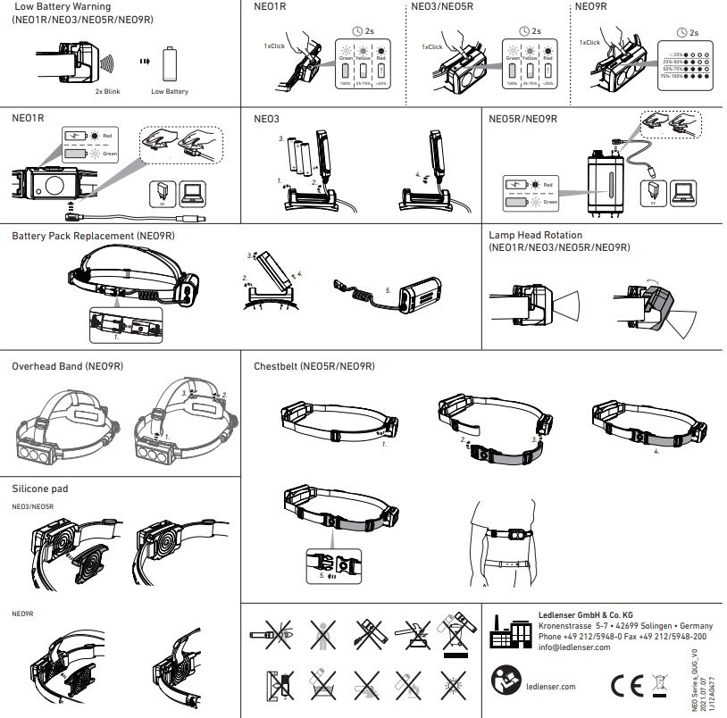 Obsah balení: svítilna LEDLENSER NEO 5R, dobíjecí baterie, silikonová protiskluzová podložka, magnetický dobíjecí kabel, hrudní pás