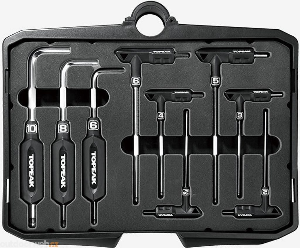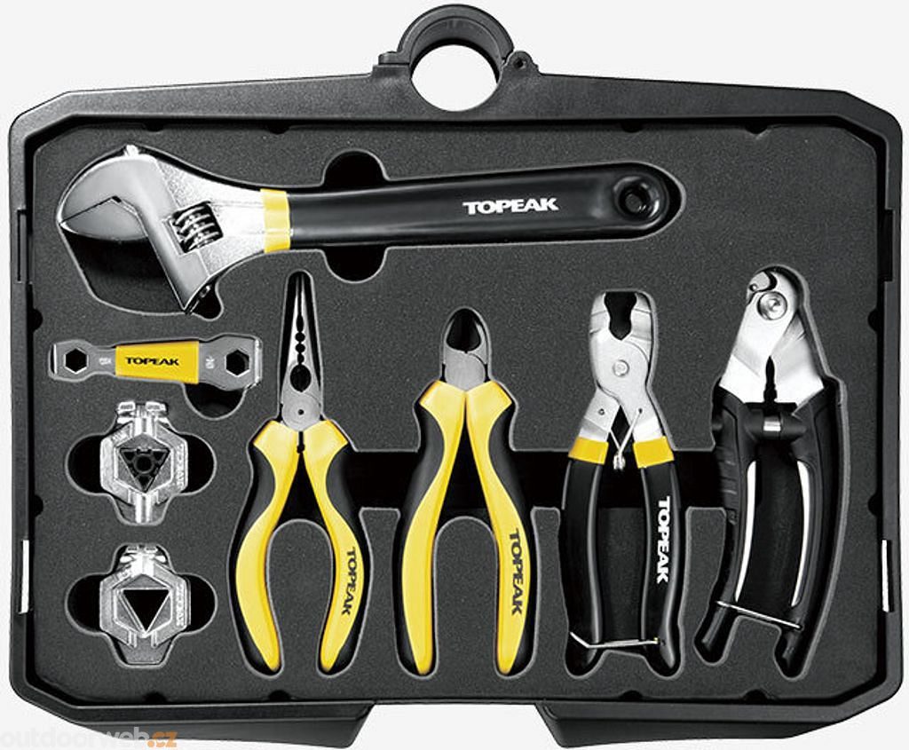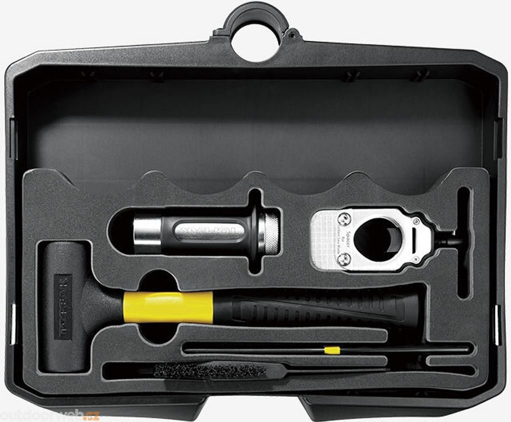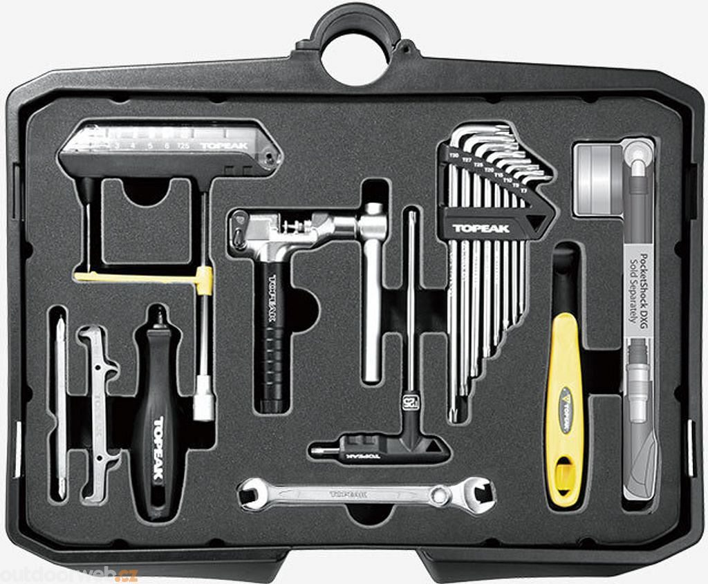 Obsah: Imbusové klíče 2–10 mm, Torx® klíče T7–T30, šroubováky (plochý a křížový), centrovací klíče (13G, 14G, 15G, Shimano® 4,3 mm, Mavic® M7/M9), stranové klíče 7–10 mm, nástrčný klíč 7 mm, nýtovačka CrMo, hák na řetěz, měrka roztažení řetězu, imbusové bity, Torx® bit T25