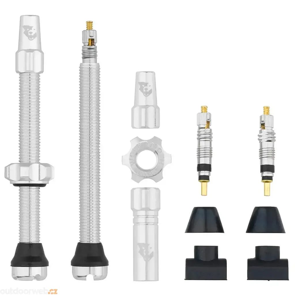 Balení obsahuje: dva ventilky, dva hliníkové klíče na vložky, dvě matice, dvě náhradní ventilkové vložky, tři gumové patky (dva typy kuželů a jedna patka do středového kanálu).