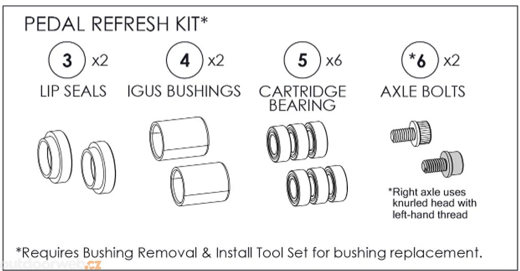 Sada obsahuje všechny opotřebovávané komponenty, které je třeba pravidelně vyměňovat - těsnění, pouzdra, ložiska a šrouby náprav. Díky tomu si můžete své pedály udržovat v perfektním stavu a zajistit jejich dlouhou životnost a hladký chod.